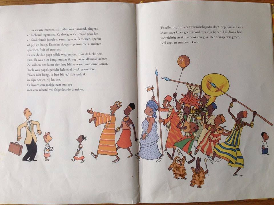 De verdere inhoud draagt bij aan de verontwaardiging. Weer dat stereotype beeld dat alle zwarte mensen in een Afrikaans land wonen en er zo uitzien als op de illustraties uitgebeeld is. Tevens blij zijn met de komst van witte mensen (dit is wel heel erg, niet waar? Waar doet het u aan denken?). Alsof we nog ver voor de slavernijtijd leven. “Vriendschapsdrankjes? Sommigen zelfs met speren en messen?”