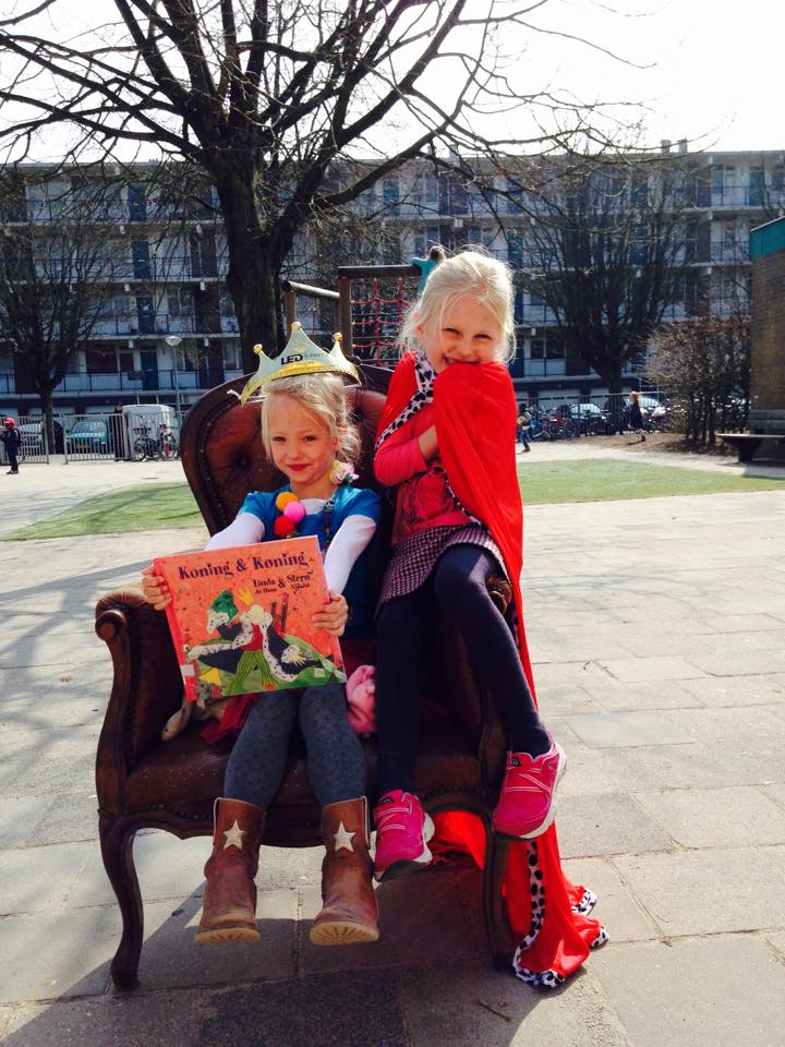 Ik laat de laatste illustratie aan de kinderen zien. Koning en Koning kussen elkaar. In deze kleuterklas in Amsterdam-Noord ontvouwt zich vervolgens de volmaakte maatschappij in het klein. Een luid gejuich stijgt op. Verliefd! Kussen! Getrouwd! De kleutervrienden klappen in hun handen van plezier. Een enkele enthousiasteling stampt ook met de voeten. In het gejoel klinkt een kritische noot van een kleutervriend: “Twee jongens die kussen, dat kan toch niet?”