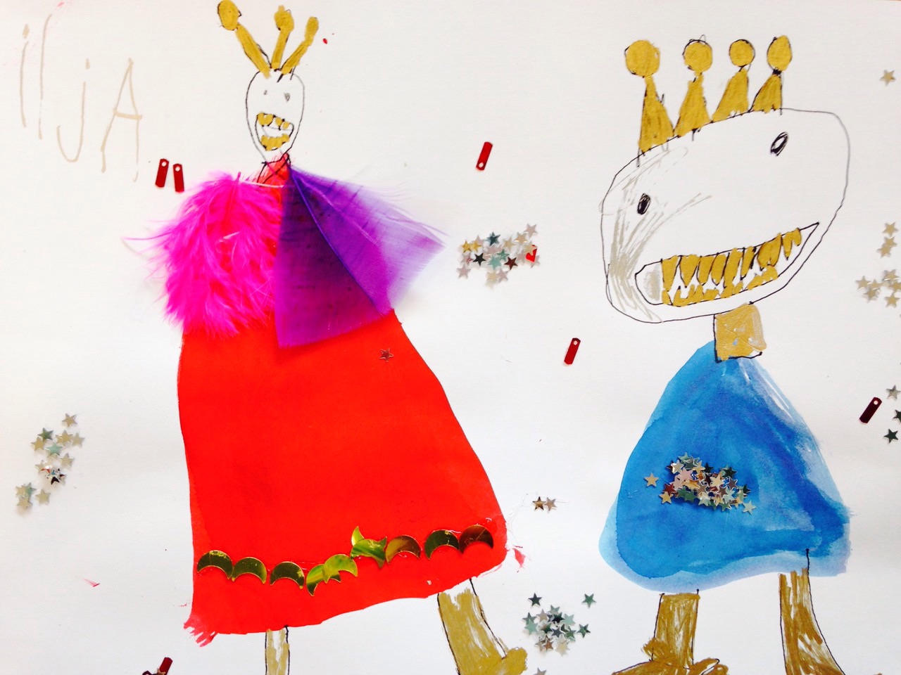 Na het verhaal gaan we koningen maken van pen, ecoline en glitters. “ We hebben de gouden juffen-pen ook nodig”, zegt Gerald. “Om gouden tanden mee te maken. Dat is mooi, als je onder en boven glimmende tanden hebt. Koningen hebben dat”.